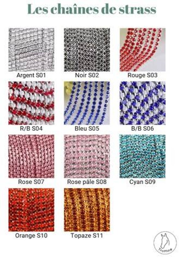 IMPORTANT : Indiquer en commentaire les références des cordelettes, rubans paillettes et/ou chaînes de strass selon le nuancier.